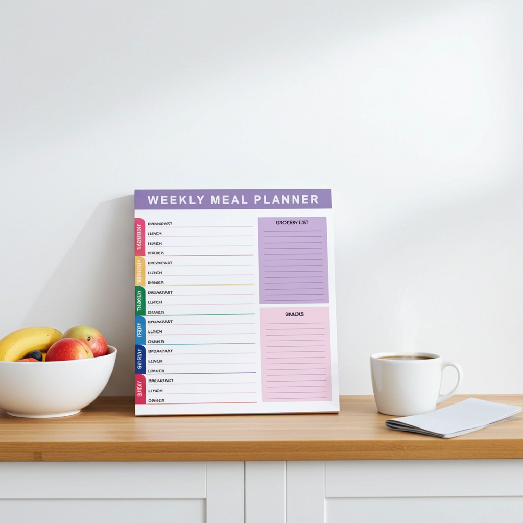 Streamline your weekly meal preparation with this comprehensive planner notepad. Featuring dedicated sections for breakfast, lunch, dinner, and snacks across all seven days, it helps you organize meals efficiently and reduce decision fatigue. The integrated grocery list section keeps your shopping organized and ensures you don't miss essential ingredients. Bound in a vibrant purple cover, this practical tool transforms meal planning from overwhelming to manageable, saving time and supporting healthier eating habits throughout the week.